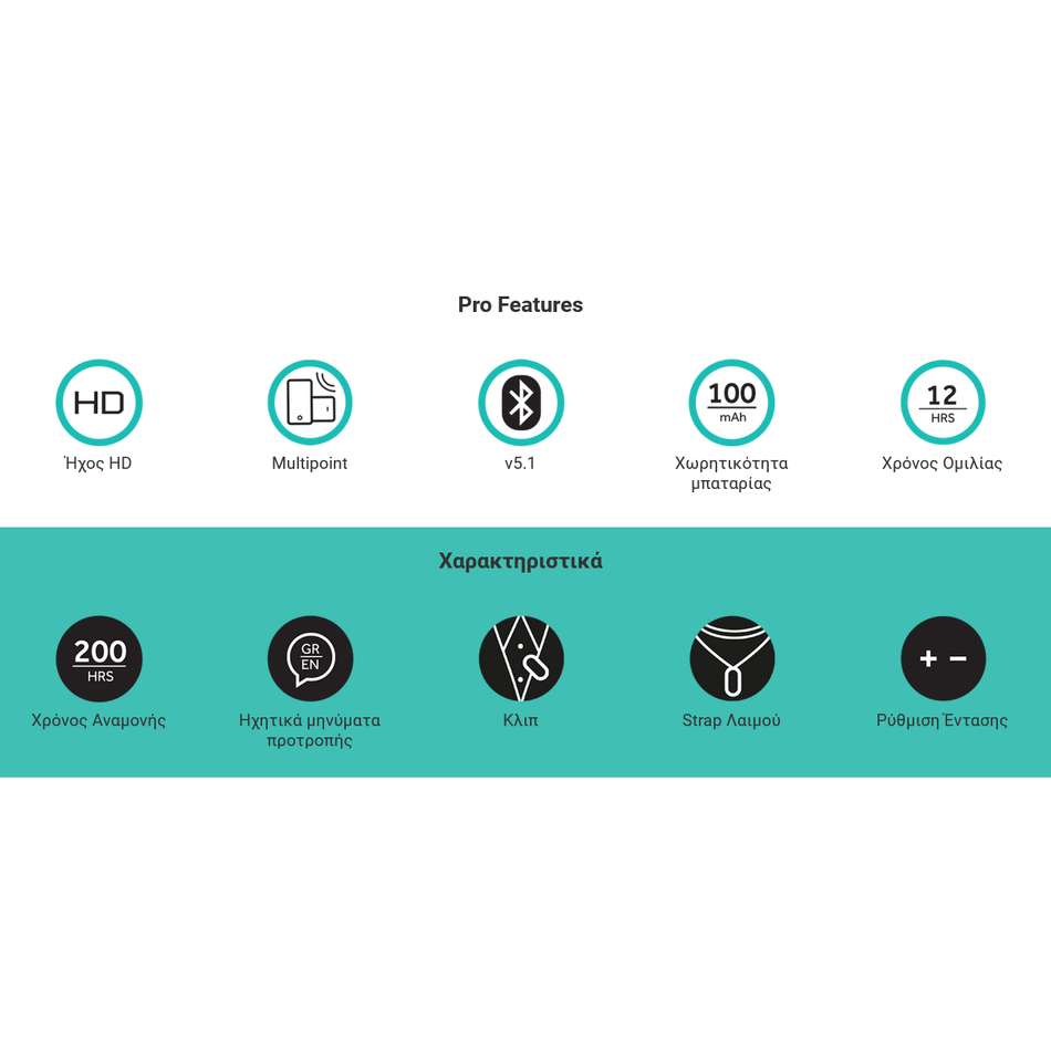 Ακουστικό RH120, καλώδιο φόρτισης, strap λαιμού, 3 τεμ. eartips σιλικόνης (S, M, L), οδηγίες χρήσης, κάρτα εγγύησης.