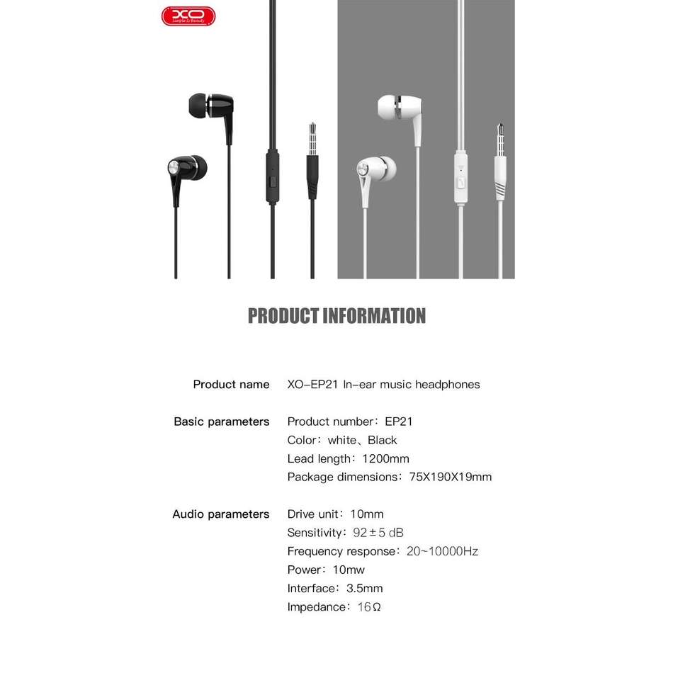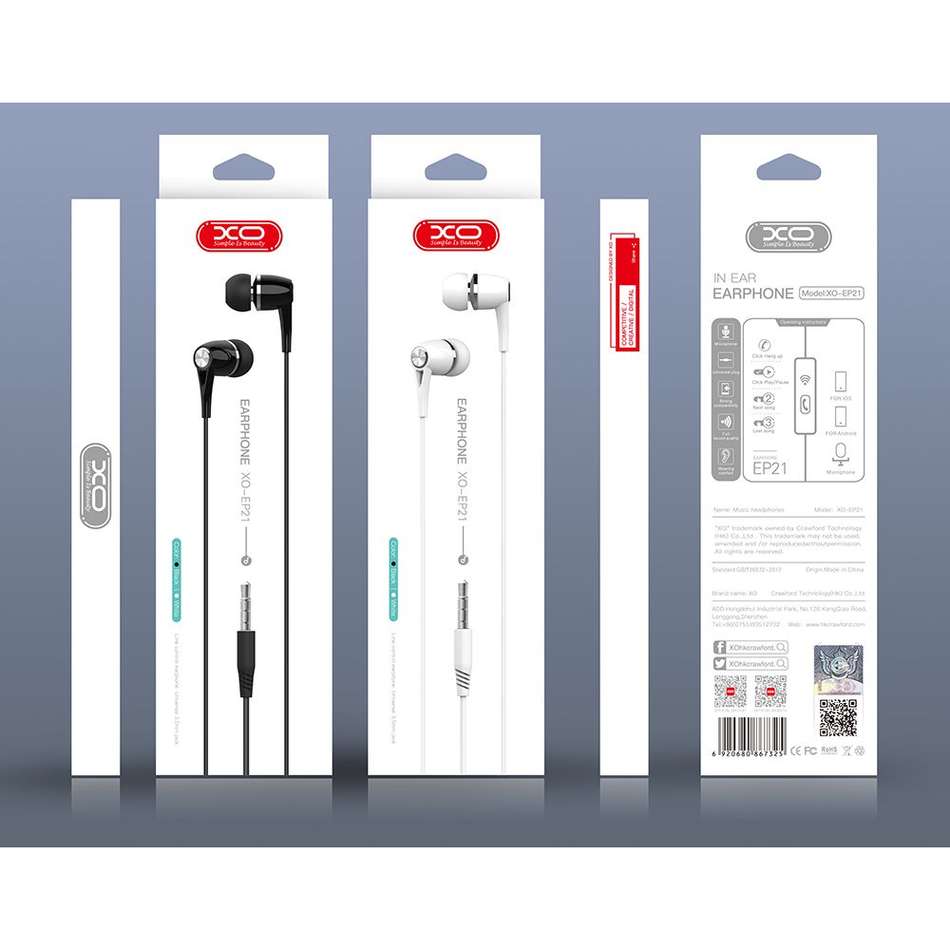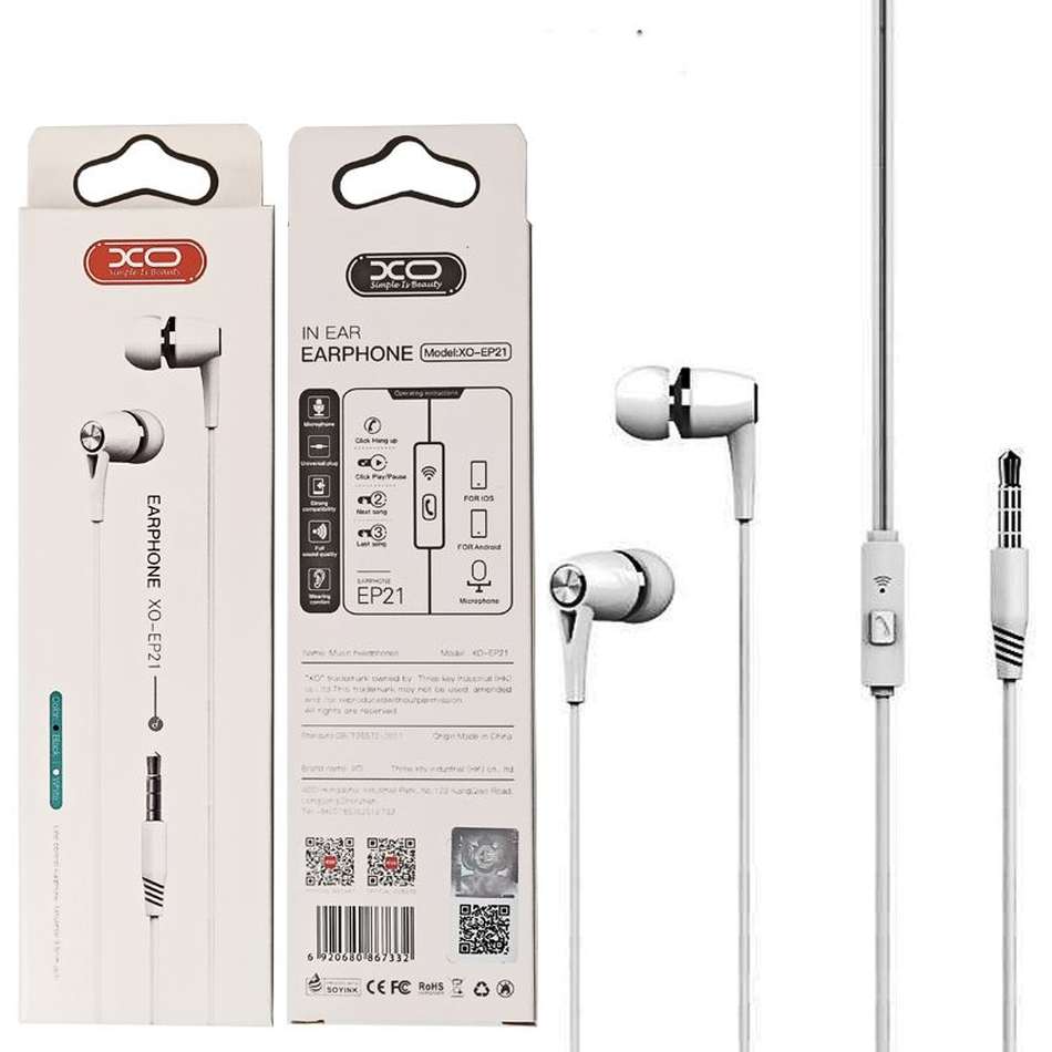 Τα XO EP21 είναι ενσύρματα ακουστικά με ενσωματωμένο μικρόφωνο για συσκευές εξοπλισμένες με υποδοχή jack 3,5 mm. Είναι γενικής χρήσης και ταιριάζουν σε πολλές συσκευές όπως: smartphone, mp3 / mp4 players, τηλεόραση και άλλες. Το καλώδιο από εύκαμπτη σιλικόνη θα εξασφαλίσει τον μεγαλύτερο δυνατό χρόνο χρήσης.